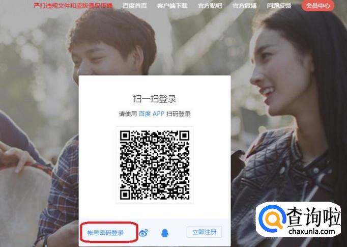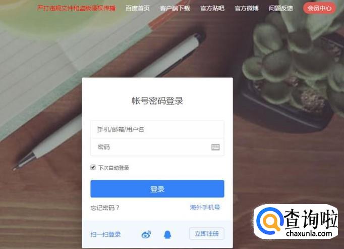 在百度网盘的首页,点击“账号密码登录”。百度账号是通用的,没有的话就注册一个。