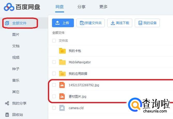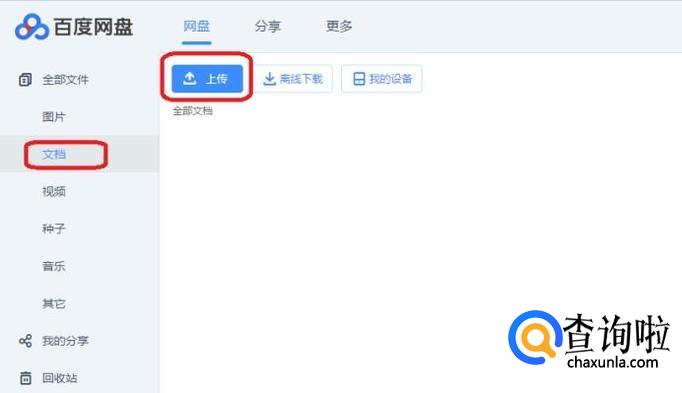 进入“百度网盘”页面,直接点击“文档”,然后点击“上传”(注:点击“图片”是没有上传选项的)。选择需要上传的图片上传即可。