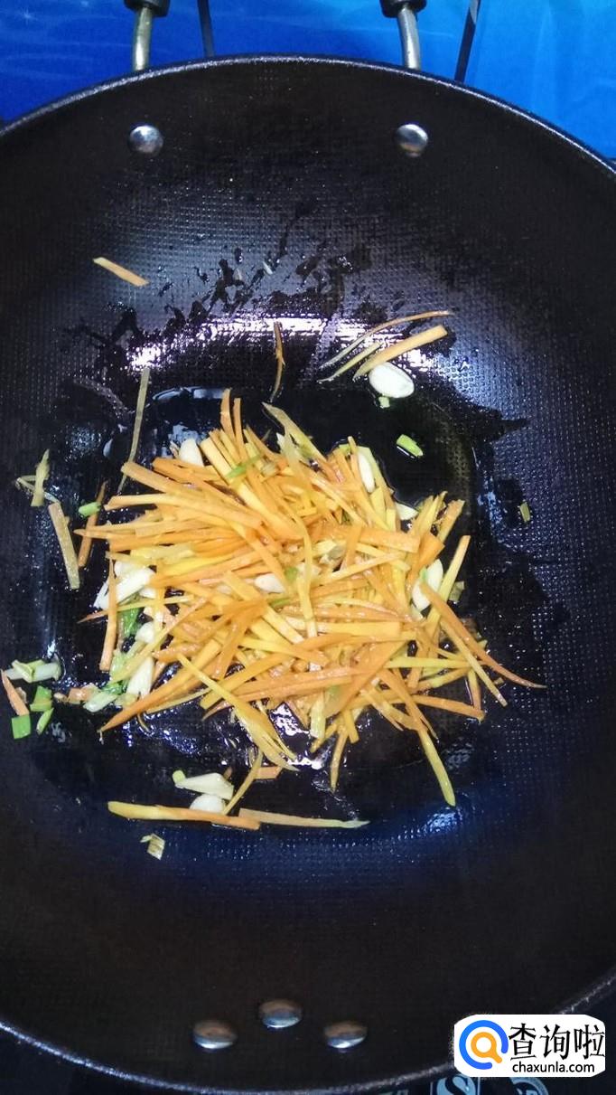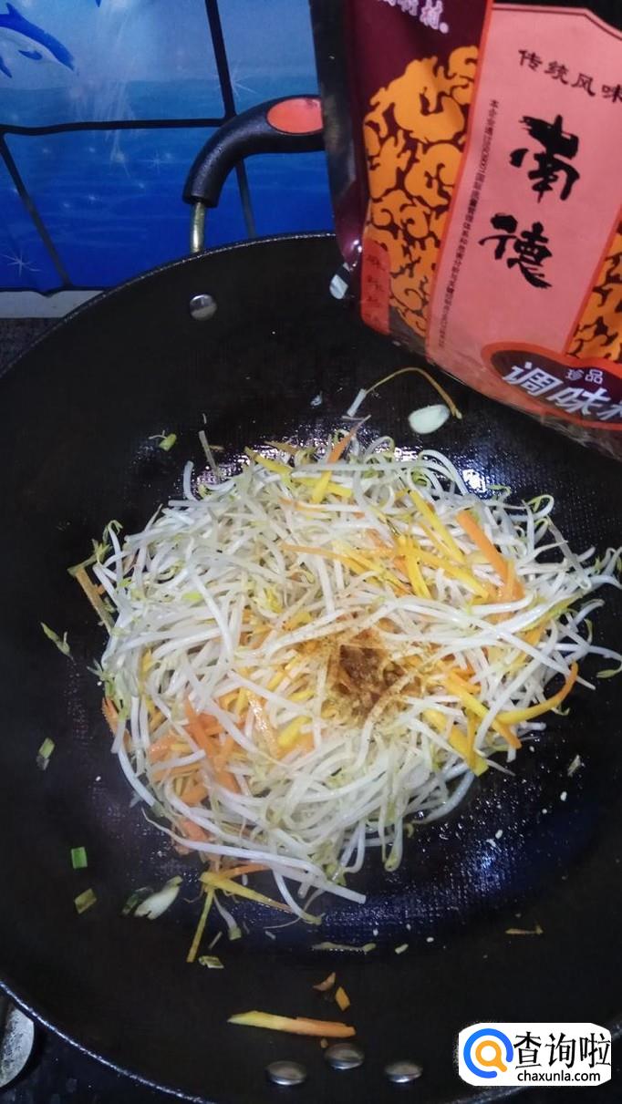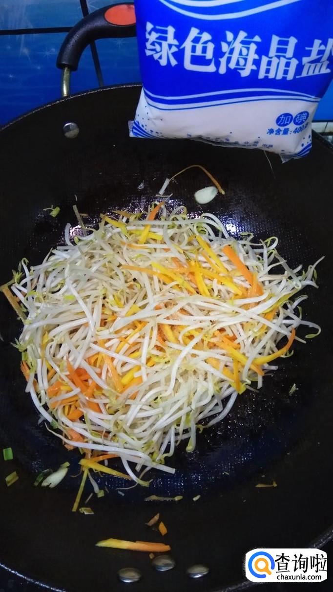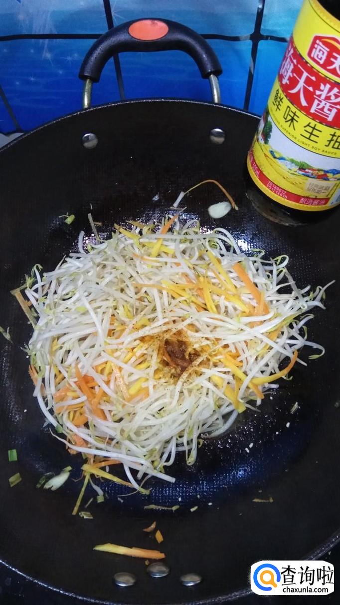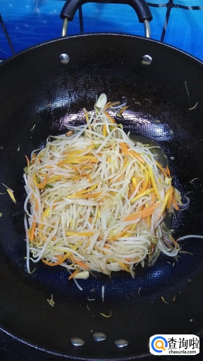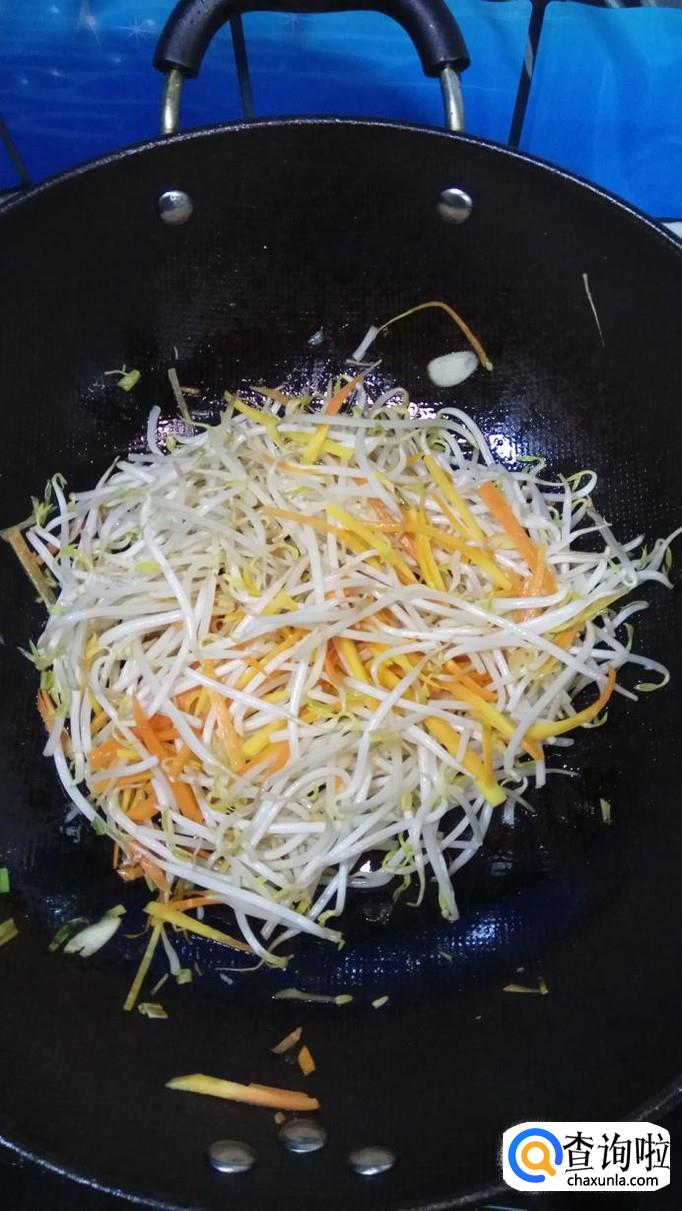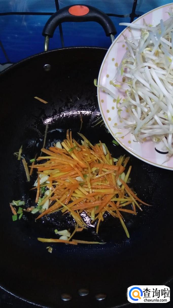 将准备好的胡萝卜丝倒入锅中,翻炒均匀,胡萝卜丝比豆芽难熟一点,所以要先放。