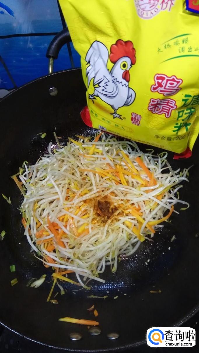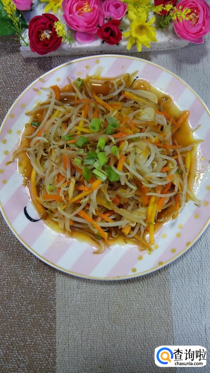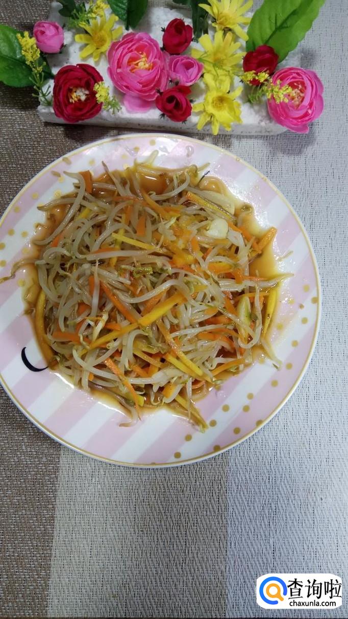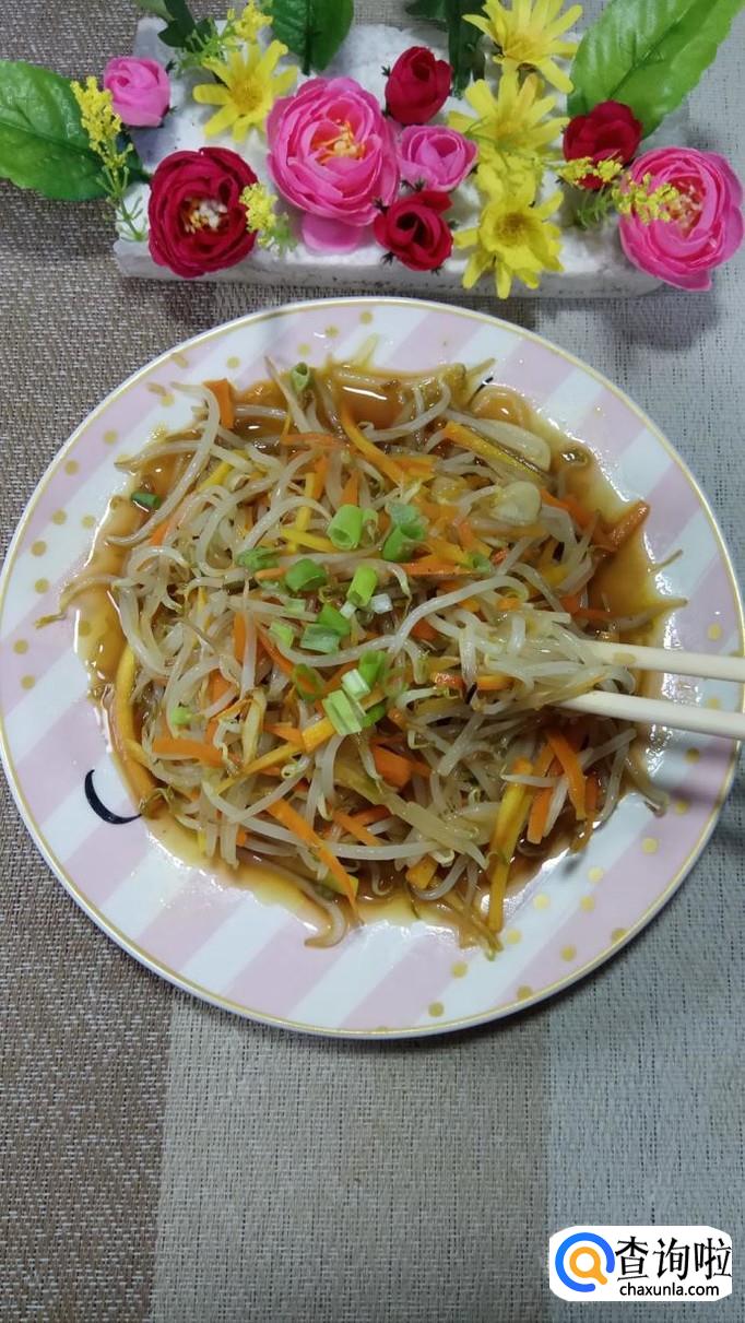 胡萝卜适量,豆芽适量,小葱适量,盐适量,鸡精适量,五香粉适量,生抽适量,陈醋适量。