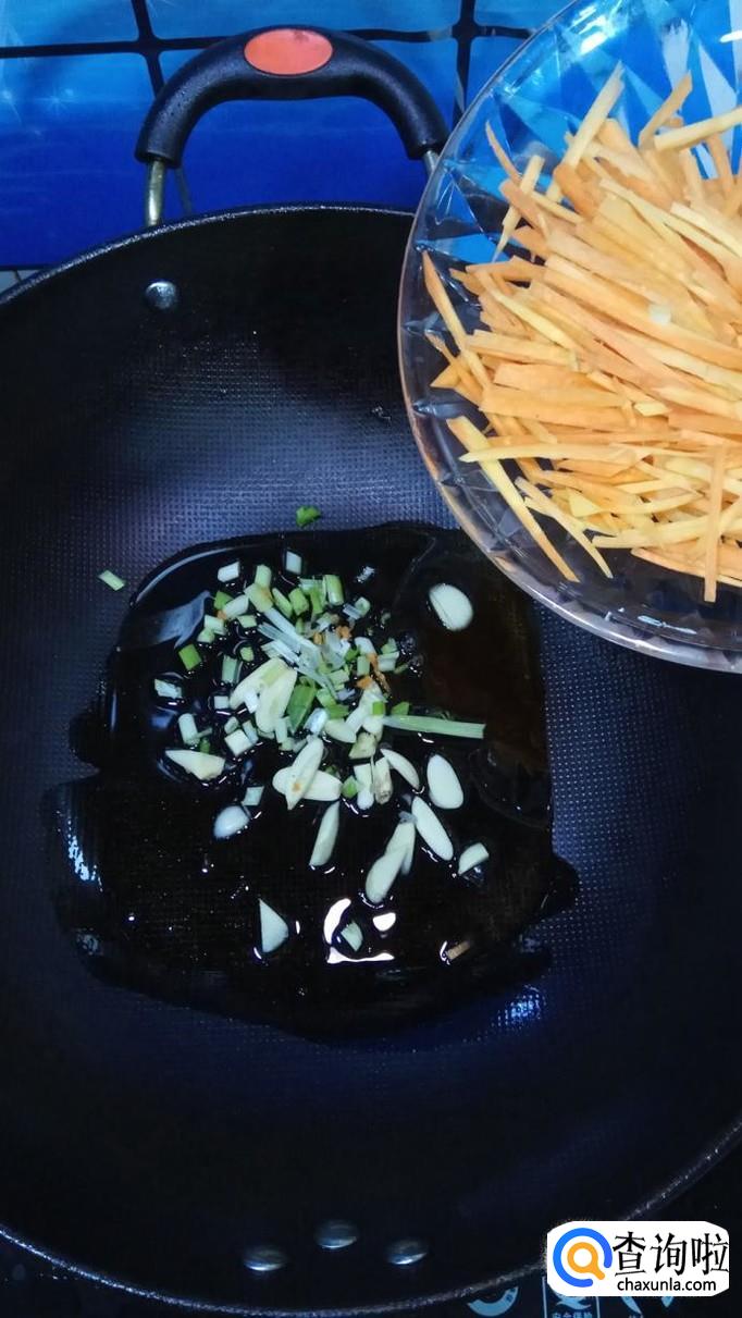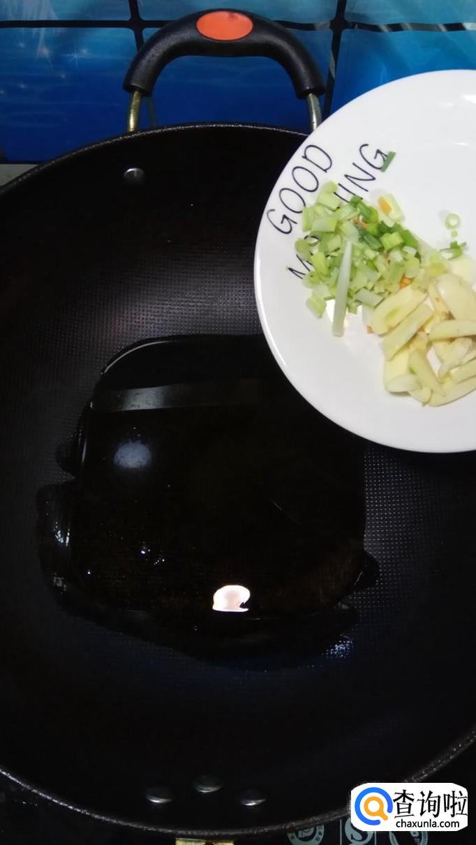 炒锅中放入适量油,油热后,将小葱碎和蒜片放入锅中炒香。