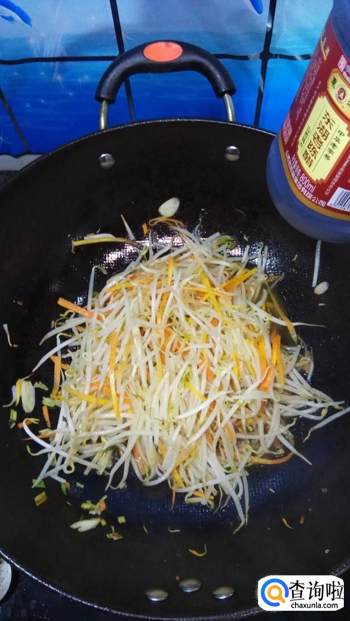 炒至胡萝卜丝变软之后,将控好水的绿豆芽,放入炒锅,和胡萝卜丝一起翻炒。