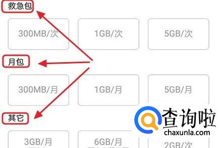 在流量包对应的下方有流量包分类,比如救急包、月包以及其它,我们可以根据自己的实际需要购买;