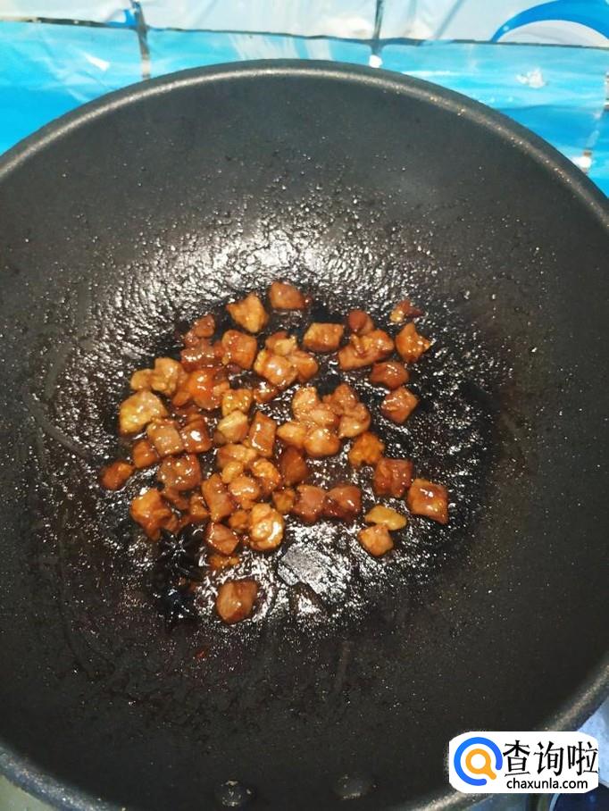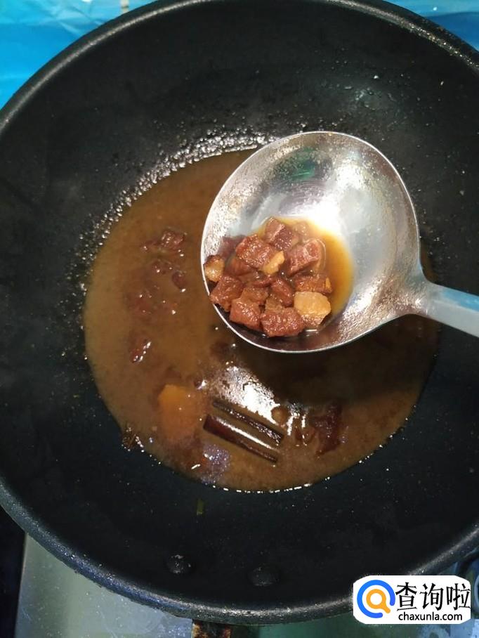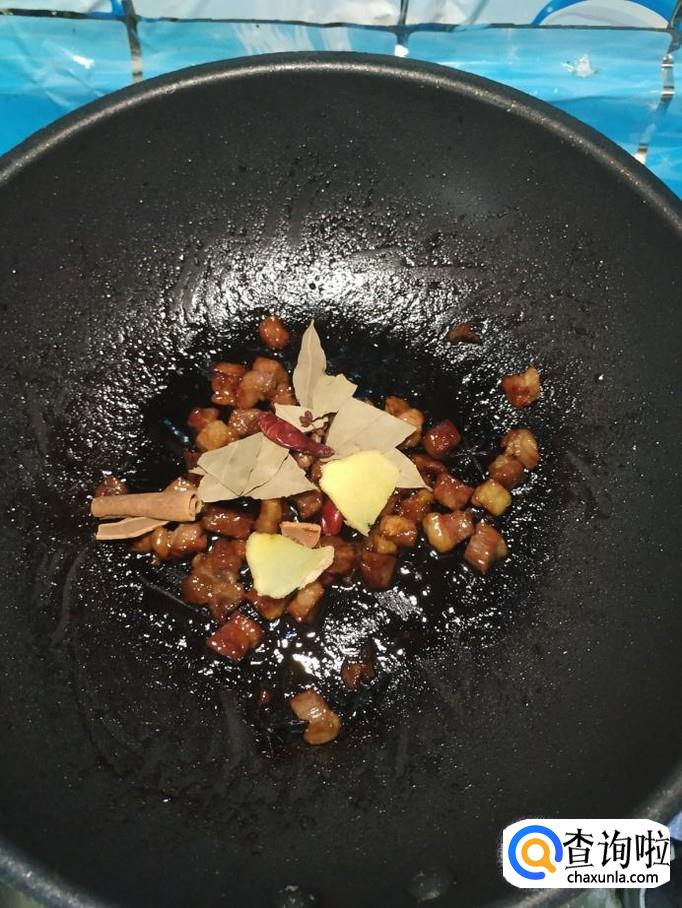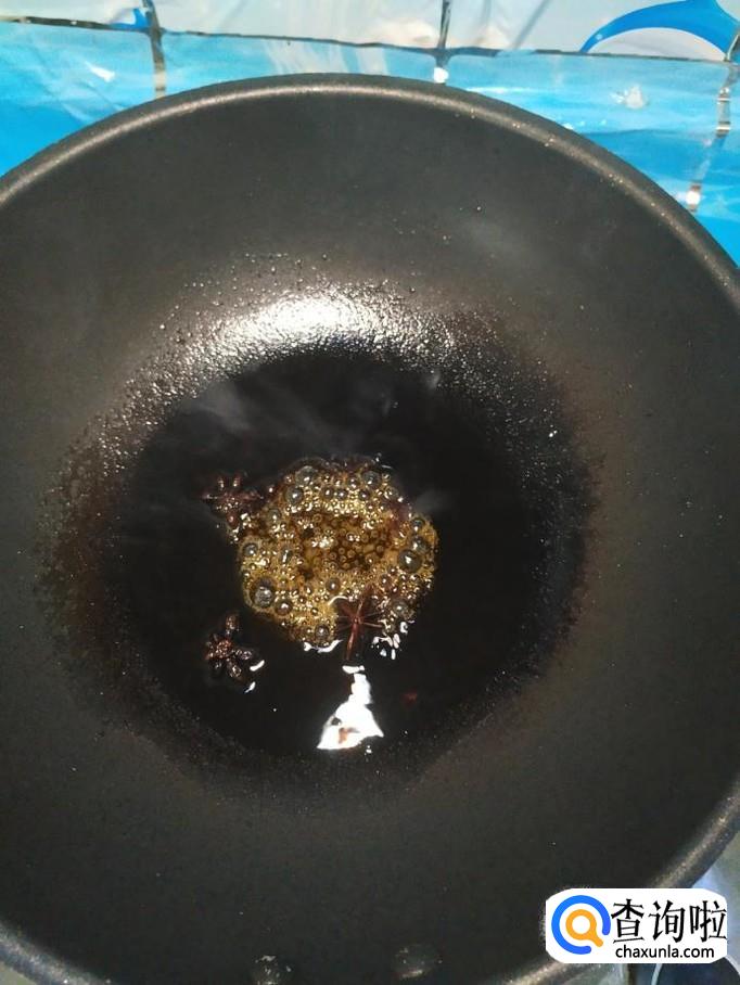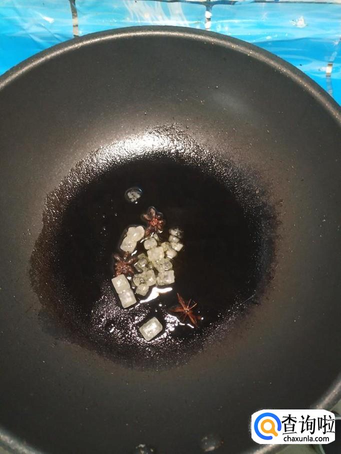 炒锅中放入适量油,油热后放入适量八角炒香,再放入适量冰糖块,炒至冰糖融化,炒出糖色后,将牛肉块倒入锅中,沾上一层糖色。