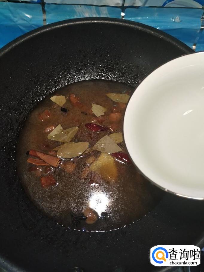 放入适量花椒,香叶,生姜片,干辣椒等大料,炒出香味。