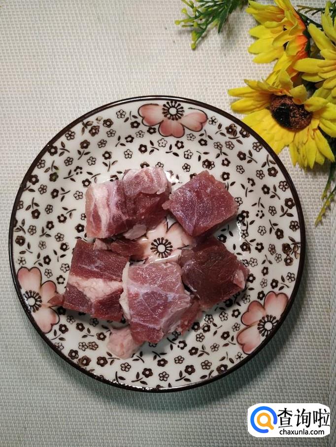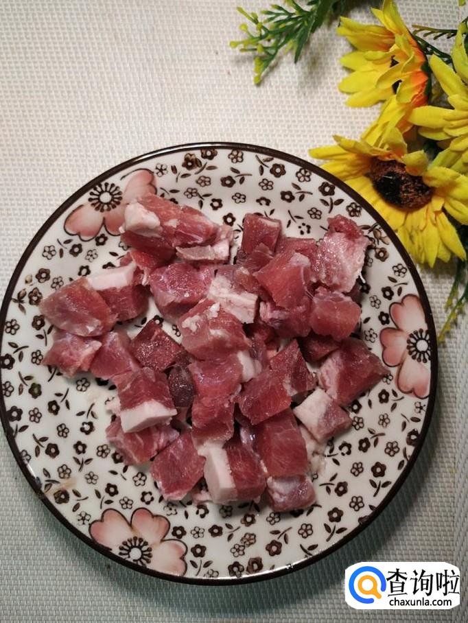 准备适量新鲜的牛肉,洗净后,切成块,放入盘中备用。牛肉熟之后,会缩小一下,根据自己的喜好,牛肉块儿可以切得稍微大一些。