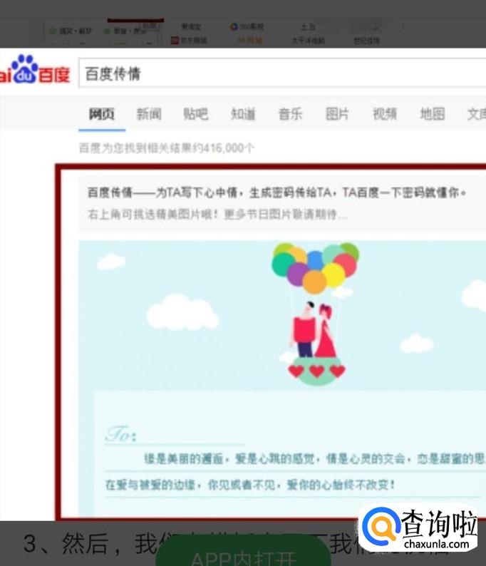 百度传情是一个可让你在百度网页搜索结果页中,向某个人送出祝福、传递情感的小程序。