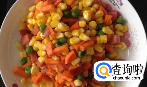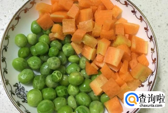 加入适量玉米粒、豌豆、胡萝卜丁,加入适量盐,翻炒均匀。