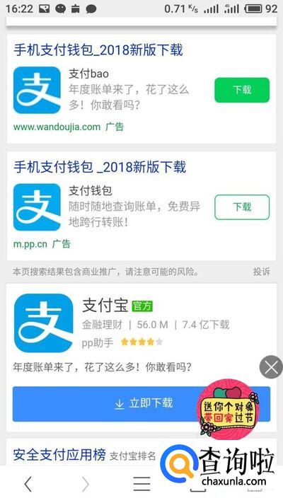 点击搜索后就可以看到支付宝下载链接,点击打开官方版,一般是低版本的。