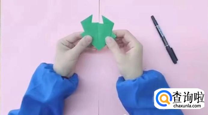 将纸翻过来,打开一侧纸向内折出青蛙的后腿,再对称折出另一侧的青蛙后腿。
