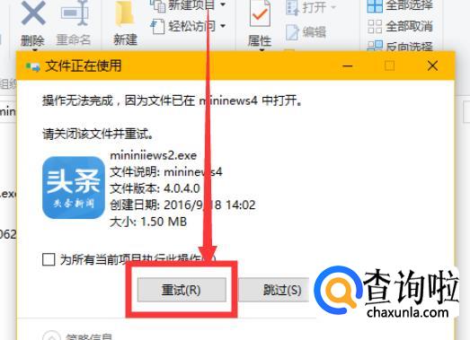 点击删除后,桌面会弹出一个对话框,这样就删除不了,点击上面的【重试】。