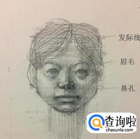 这里的比例很重要相互比较找出不对的地方进行调整,注意五官透视关系,这时候稍加一点调子,大家可以根据以上的步骤练习不同的人脸。(只要看起来自然就可以,其他可以不过多的追求)。