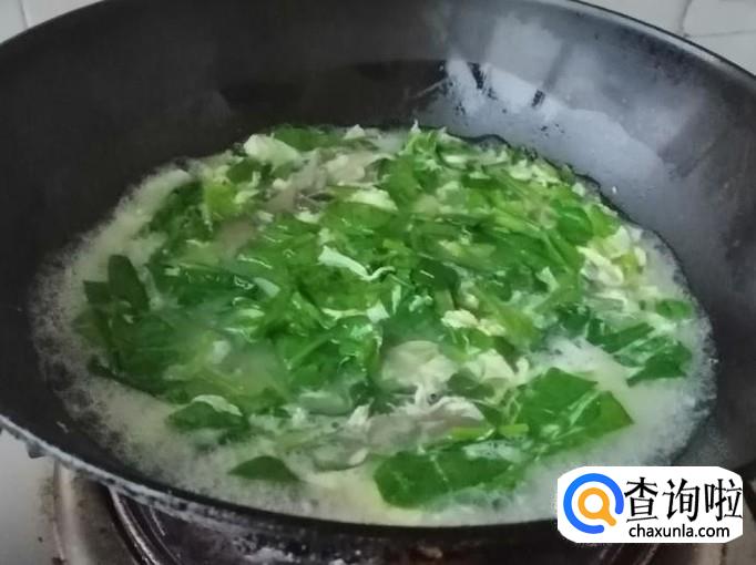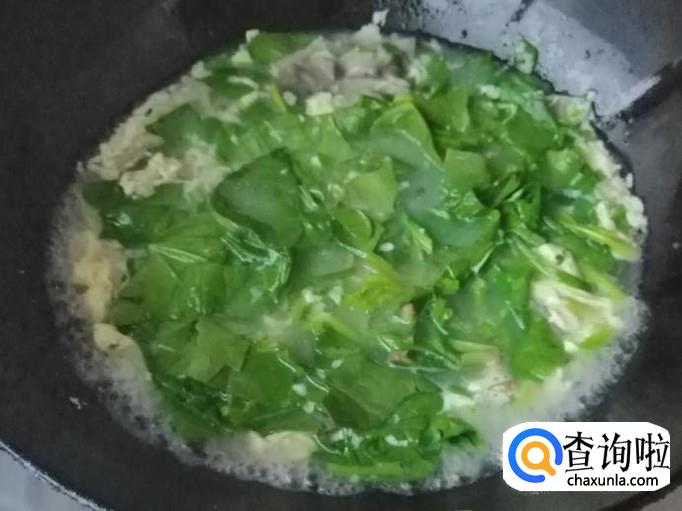 撒上备好的香菜,倒入适量香油,用勺子搅拌均匀,加入备好的菠菜叶,再次煮开就可以了。