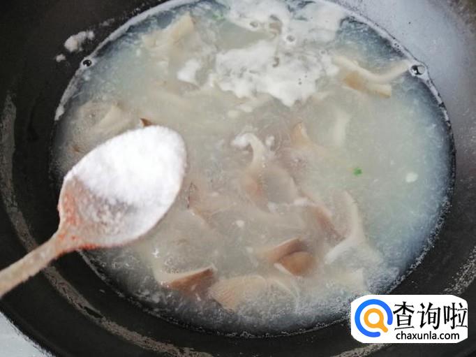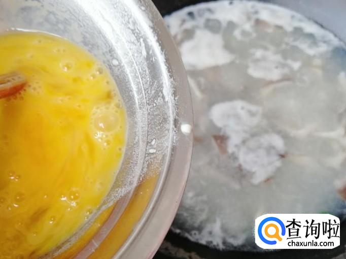 蘑菇煮熟后,先加入备好的面糊,用勺子搅拌均匀,再加入适量食盐,然后加入备好的鸡蛋液,等蛋液浮出汤面就可以了。