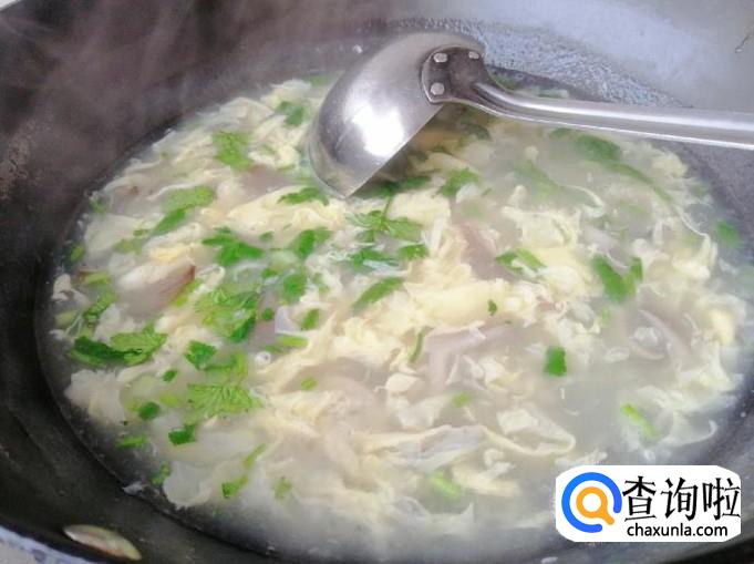 如图所示,我们的蘑菇菠菜蛋花汤就做好了,关火撒上胡椒,蘑菇蛋花汤出锅入汤碗,营养全面又好看的蛋花汤,就可以上桌开吃。