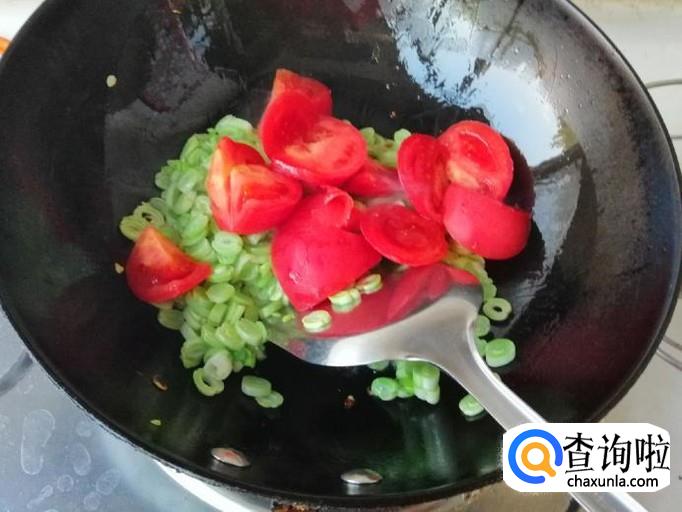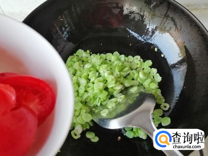 炒锅放油,油热后放入葱末炒香,因为芸豆熟的慢,所以先煸炒芸豆末,翻炒片刻后,加入备好的西红柿翻炒均匀。