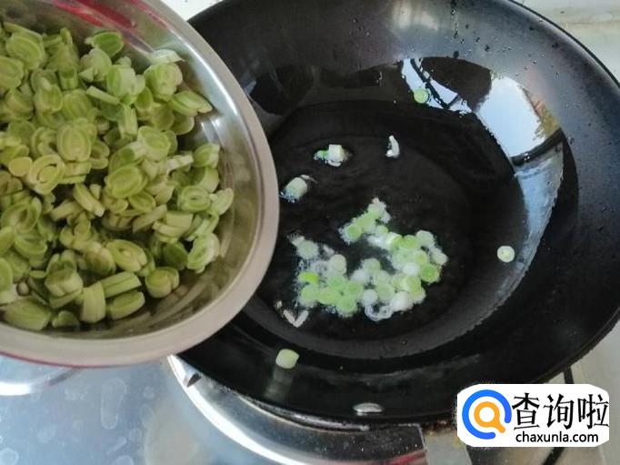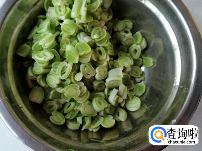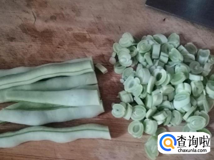 先把这几根芸豆用清水洗净,去头尾抽丝,然后放在菜板上如图切细,这里切碎主要是为了熟的快,切好盛入容器待用。