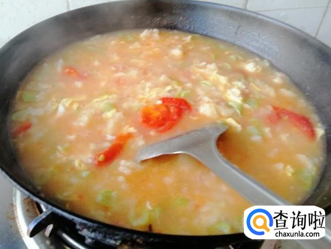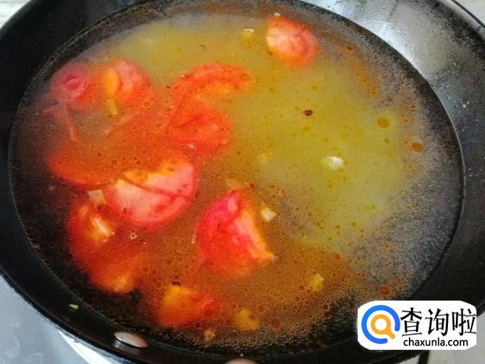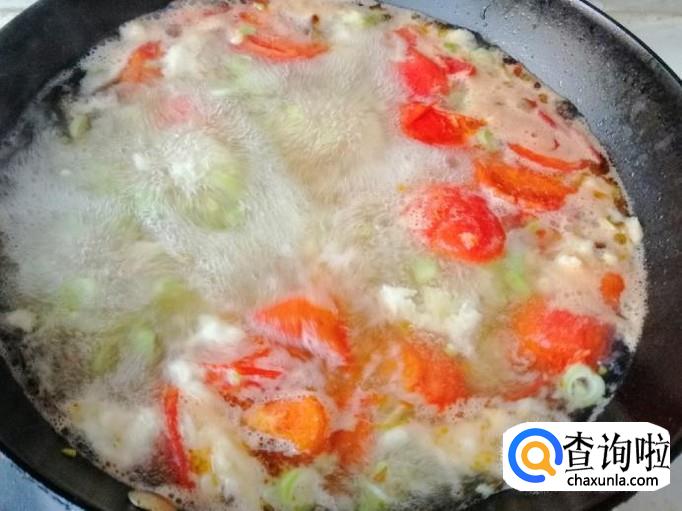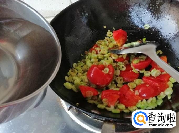 加入西红柿后可以这时候放适量盐,这样西红柿容易炒出汁,翻炒片刻后加入备好的适量水,盖上锅盖煮开。