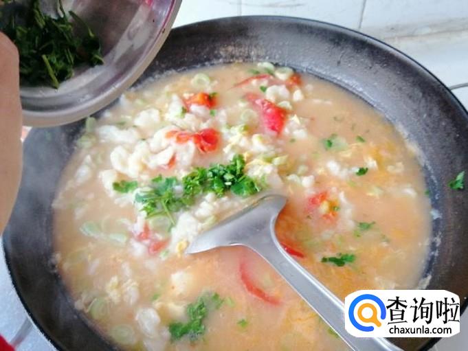 把所有面团都下完后,煮3分钟左右就可以了,怕不熟可以尝尝,最后加入打散的鸡蛋搅拌均匀,关火撒上香菜末,再放入胡椒就可以了,这样美味的芸豆西红柿鸡蛋疙瘩汤就做好了。