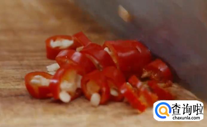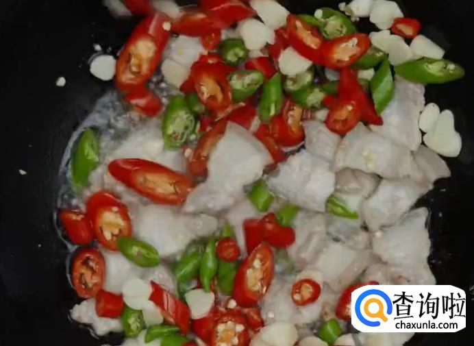 之后热锅起油,下入五花肉片煸出油香。再加入蒜片、小米椒和青红椒炒出香味。
