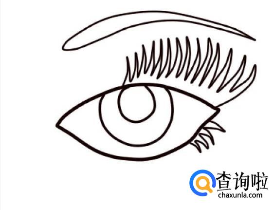 在眼睛上面画出弯弯的眉毛,左端粗,画成圆角,右边细,画成尖尖的眉梢。到此,线条就画完了。