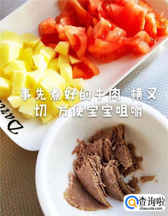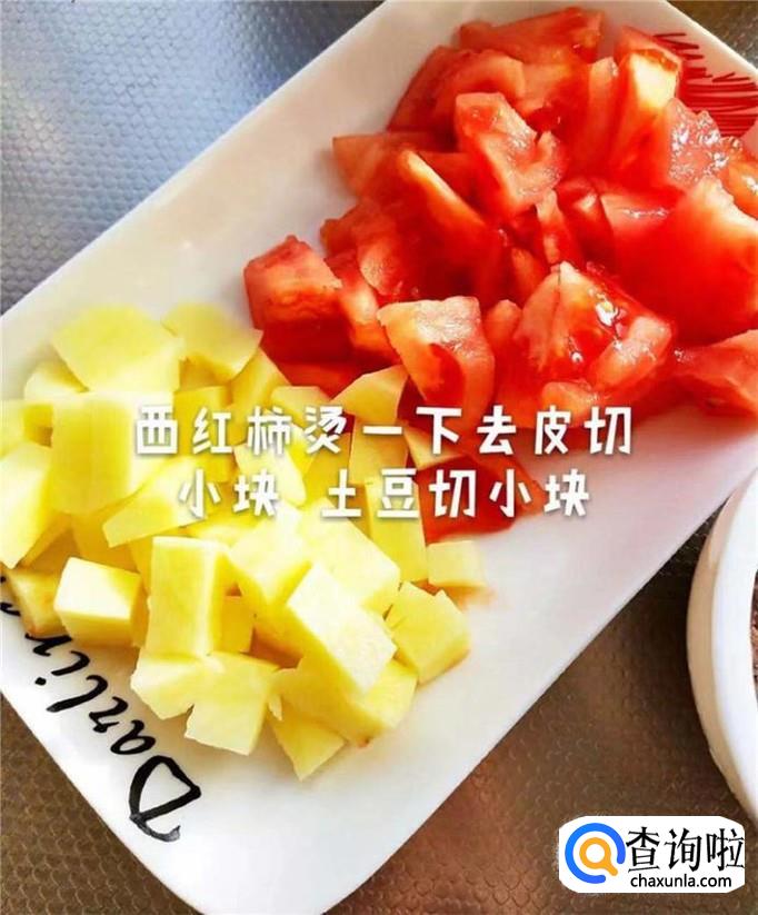 首先,将西红柿在开水中烫一下去皮切成小块;土豆洗净去皮切成丁,如下图所示。小贴士:关于。西红柿的处理小编建议大家可以用水烫一下或者是用火烧一下也是能够很好的去除表皮的。