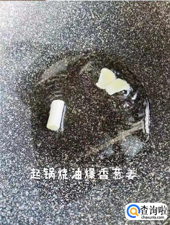 接着锅中放入一小勺的油,待油冒烟,倒入葱姜爆香,如下图所示。小贴士:关于葱姜的用量选择,因为宝宝比较小,建议大家只要用一点点就可以了。