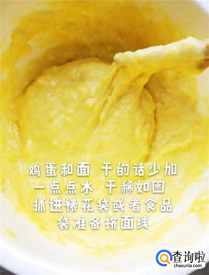 接着在碗里面加入一个鸡蛋和200克的面粉,搅拌均匀,并装入裱花袋,如下图所示。小贴士:1.大家在和面的过程当中,如果比较干,可以加入适量的清水;2.如果大家家中没有裱花袋,可以用食品袋替代。