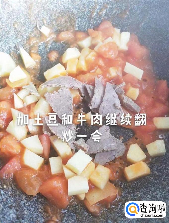 接着把切好的牛肉和土豆一起倒入锅中,和西红柿一起翻炒两分钟,如下图所示。