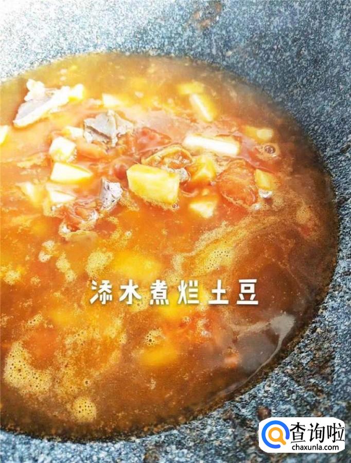 然后往锅中加入一碗清水,盖上锅盖,开大火把土豆煮熟煮烂,如下图所示。