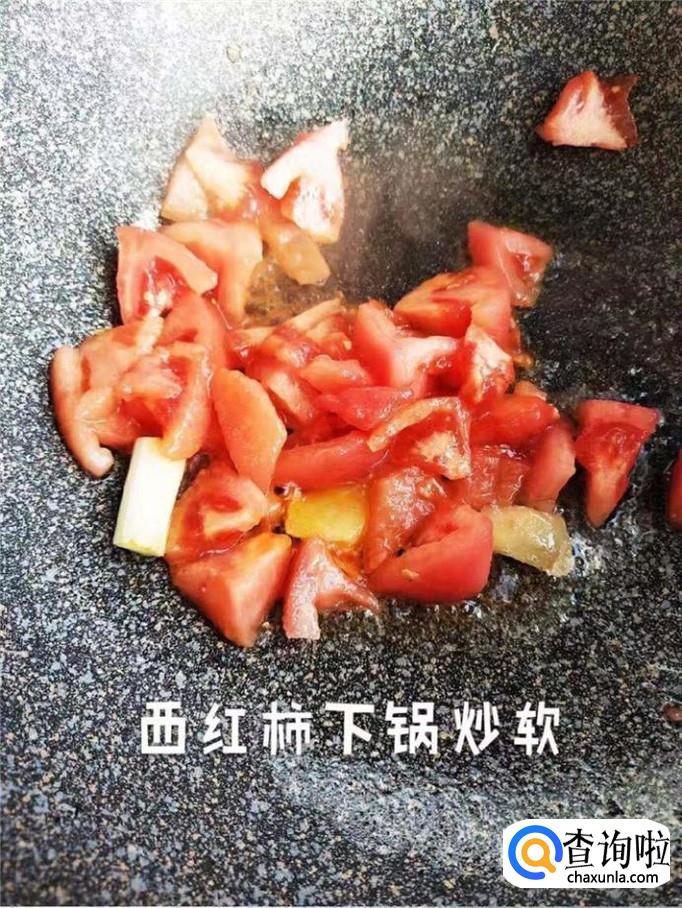 然后把切好的西红柿倒入锅中炒软,如下图所示。小贴士:大家可以根据西红柿是否出汁作为判定判定标准。