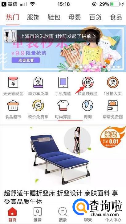 首先我们打开拼多多应用后在首页里进入到转盘领现金的活动页面。