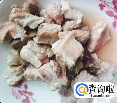 首先将买回来的排骨用开水烫一分钟,捞出沥干备用。