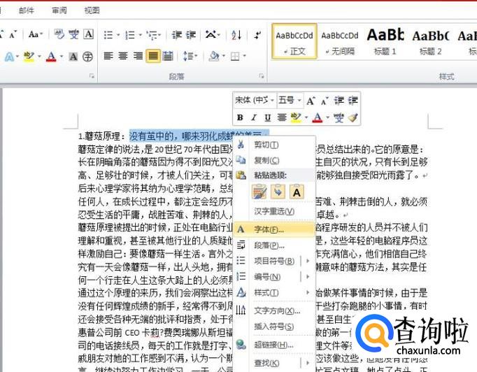 然后点击鼠标右键,在点击字体。如图。