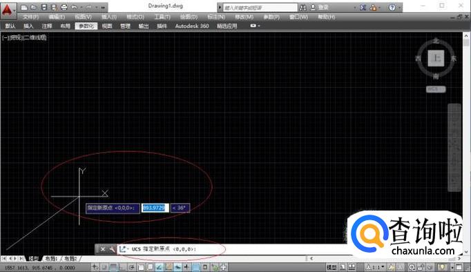 命令窗口显示"UCS 指定新原点<0,0,0>",如图所示。拾取用户坐标系新原点,单击鼠标左键确认。