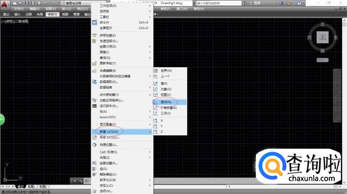 如图所示,弹出下拉列表菜单。点击"新建UCS"子菜单向右箭头,弹出级联菜单选择"原点"项。