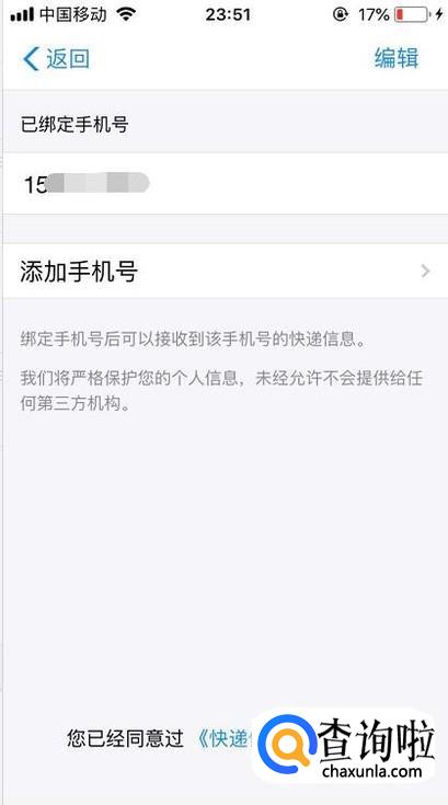 最后我们只需要绑定电话号码,以后就能够通过电话号码来查询快递了。
