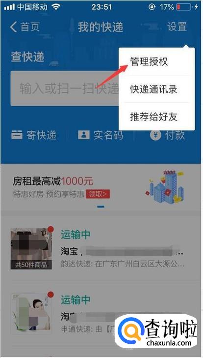 然后在我的快递页面点击右上角的设置功能,进入到管理授权。