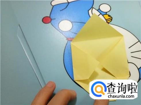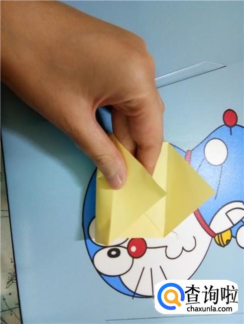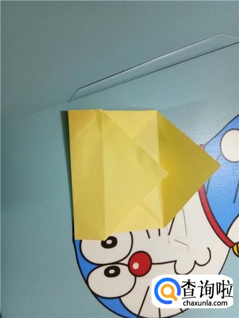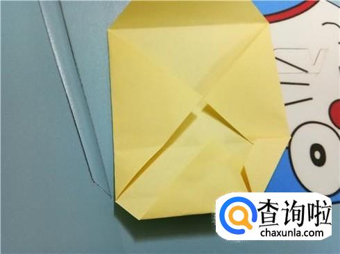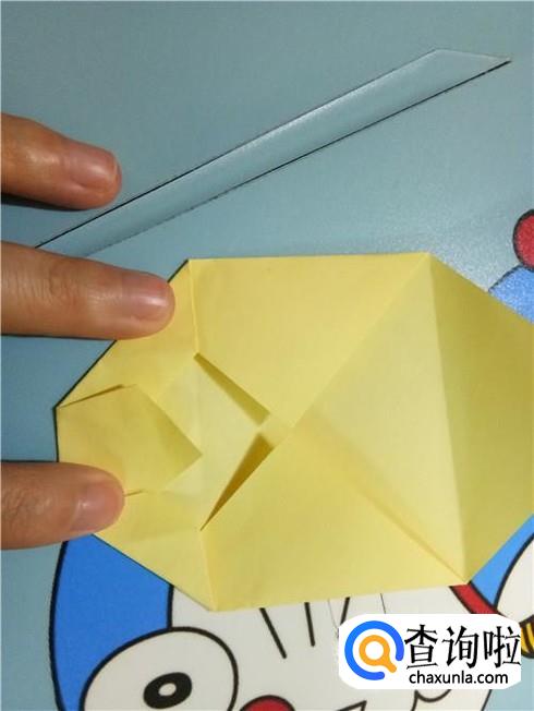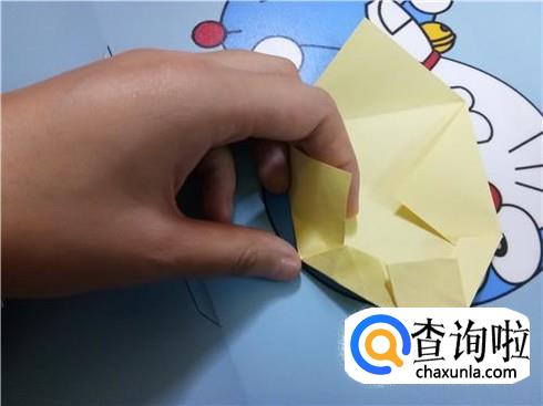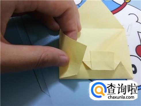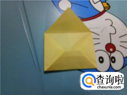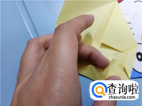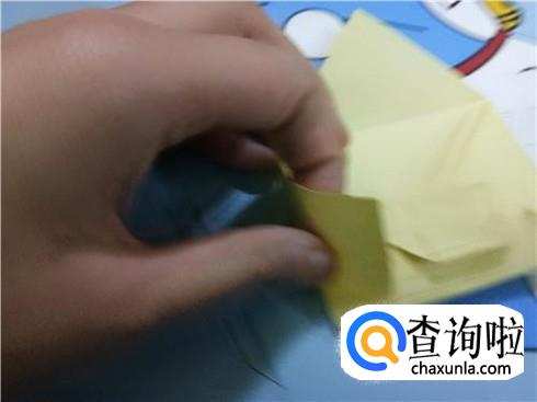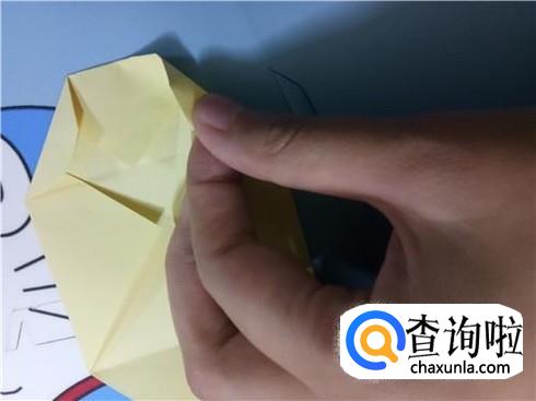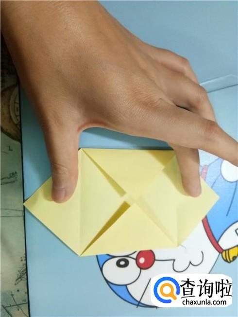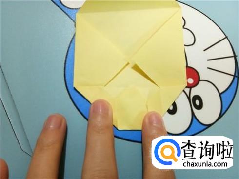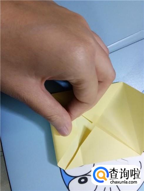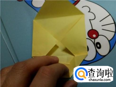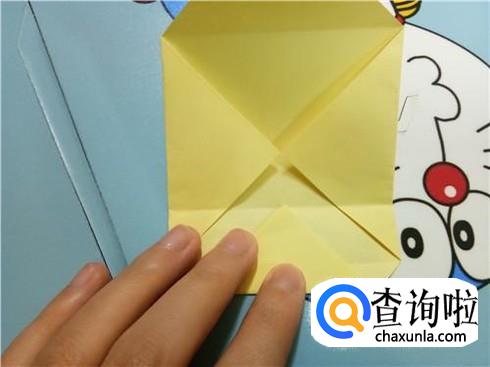 将上边相对的两个三角形像刚才的整理方法一样扯起来再按照折痕将它按下去最终压着下边的一小部分。再将下边的小正方形的一部分向上折,再轻轻地折一点回来,保持小正方形在外面。
