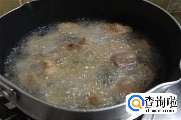 锅中放500ml油烧热(可重复使用)放入里脊肉炸至四面金黄即可出锅沥干。