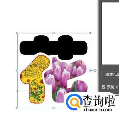 白色框内即显示出“花一”的图;鼠标再勾选“预览”;我们再看画板上“花”字的“七”已贴上了“花一”图。