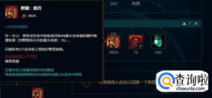 然后第一个大件先合成大的打野刀,附魔:血刃,提升剑圣的攻击速度和对野怪的额外伤害,加快了剑圣刷野速度