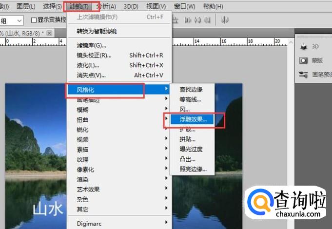 然后我们点击顶部的滤镜菜单,接着选择风格化下的浮雕效果,如下图所示
