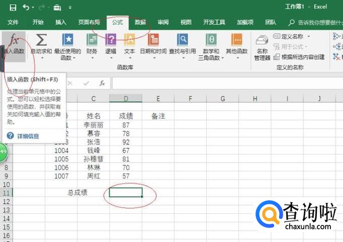 按照学院教务部数据创建工作簿文档,如图所示。选中"总成绩"单元格数据区域,点击"公式→函数库→插入函数"图标。