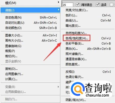 点击调整选项在其子级菜单哪里找到色相饱和度选项,如图所示: