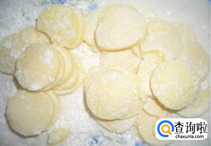 接着我们需要把切好的日本豆腐正反两面裹上淀粉备用,正反两面只需要裹上薄薄一层就可以。