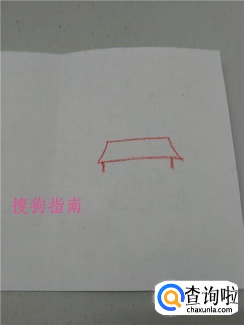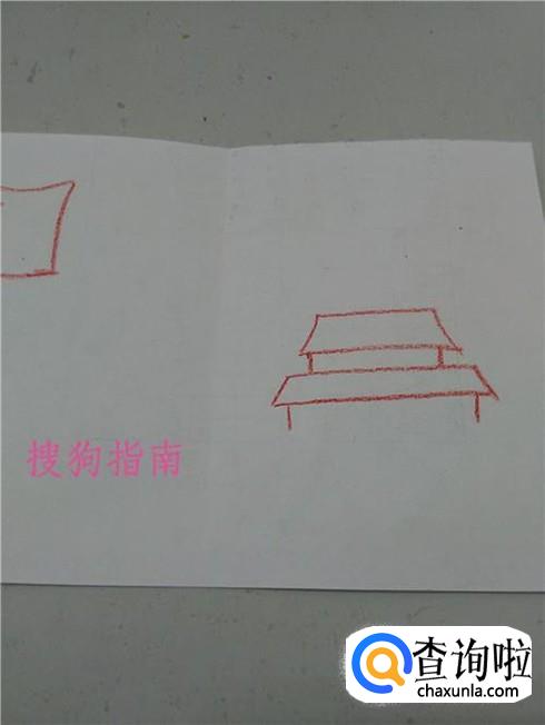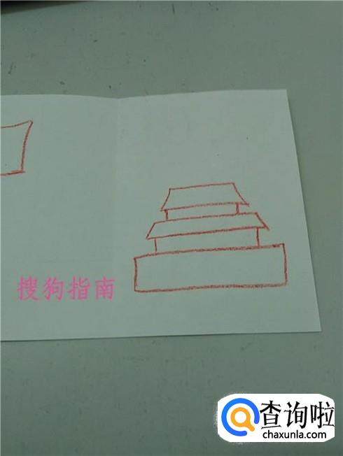 用笔在纸的右半边画一个梯形,表示天安门的楼顶。