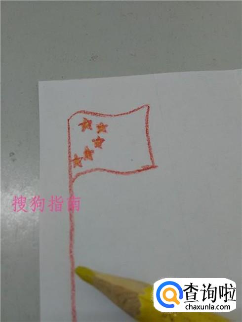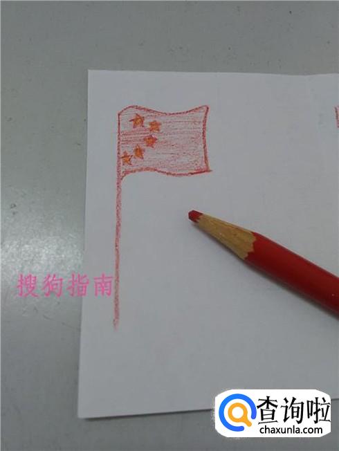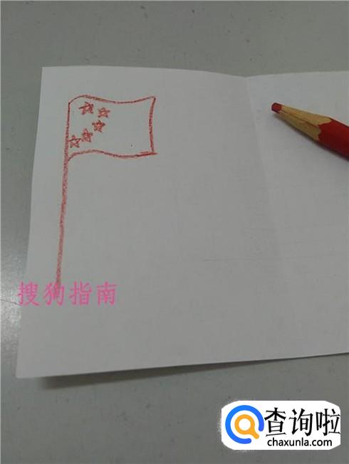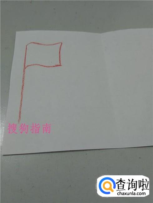 先用红笔在长方形纸的左半边画一条竖线,表示五星红旗的旗杆,再画三条曲线,表示上面的旗子。
