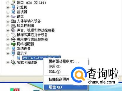 在硬件设备列表里找到“显示适配器”,点一下前边的+号,就会显示显卡的型号。在显卡上右键单击,点“属性”。