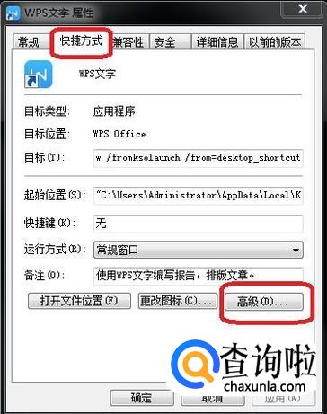 在属性面板中,点击“快捷方式”标签下的“高级”按钮。